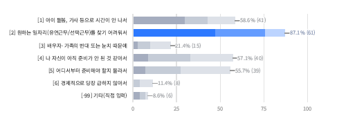 A. κ²½λ ₯보μ μ¬μ±μ 87.1%κ° μνλ μΌμ리(μ μ°/μ ν근무)λ₯Ό μ°ΎκΈ° μ΄λ €μμλ₯Ό μ ννκ³ , λ€μμΌλ‘ μμ΄ λλ΄, κ°μ¬ λ±μΌλ‘ μκ°μ΄ μ λμ(58.6%), λ μμ μ΄ μμ§ μ€λΉκ° μ λ κ² κ°μμ(57.1%)λ₯Ό μ ννμ΄μ.