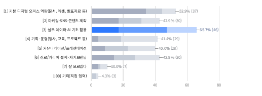 A. κ²½λ ₯보μ μ¬μ±μ 65.7%κ° μ€λ¬΄ λ°μ΄ν°Β·AI κΈ°μ΄ νμ©μ μ ννκ³ , λ€μμΌλ‘ κΈ°λ³Έ λμ§νΈ μ€νΌμ€ μλ(λ¬Έμ, μμ , λ°νμλ£ λ±)(52.9%)κ³Ό λ§μΌν Β·SNSΒ·μ½ν μΈ μ μ(42.9%)μ μ ννμ΄μ.